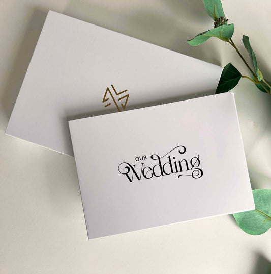 • Memory Vault video book on the table with the box it comes in which has Memory Vault logo on it. The book has Our Wedding written on it in gold colour
