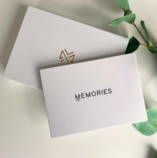 • Memory Vault video book on the table with the box it comes in which has Memory Vault logo on it. This video book is personalised with custom name written on it in gold colour